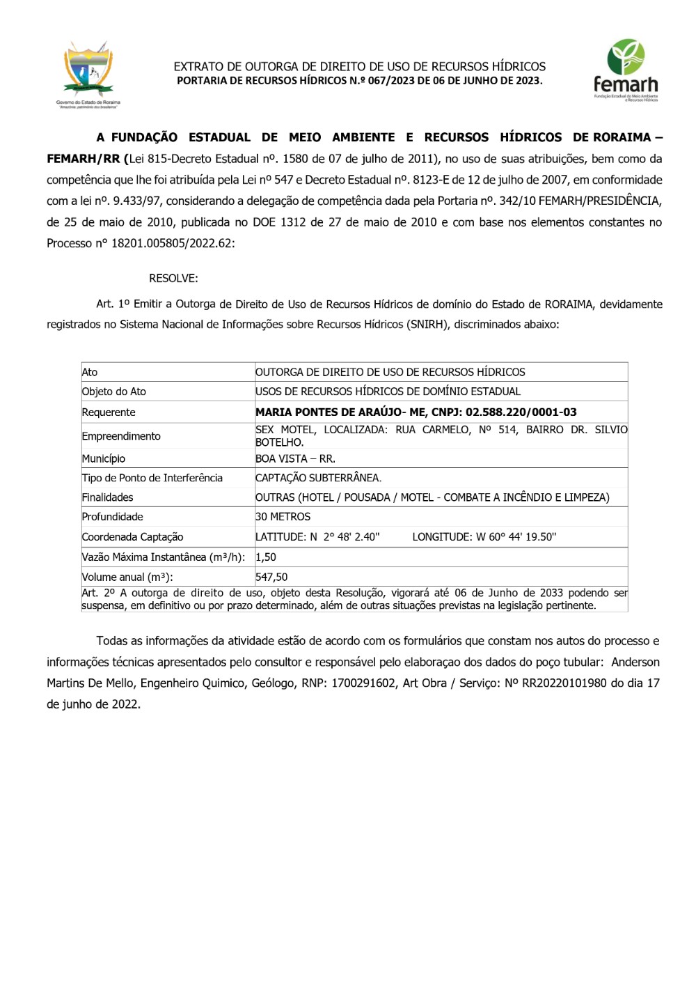 PORTARIA DE RECURSOS HÍDRICOS N.° 067/2023 DE 06 DE JUNHO DE 2023.