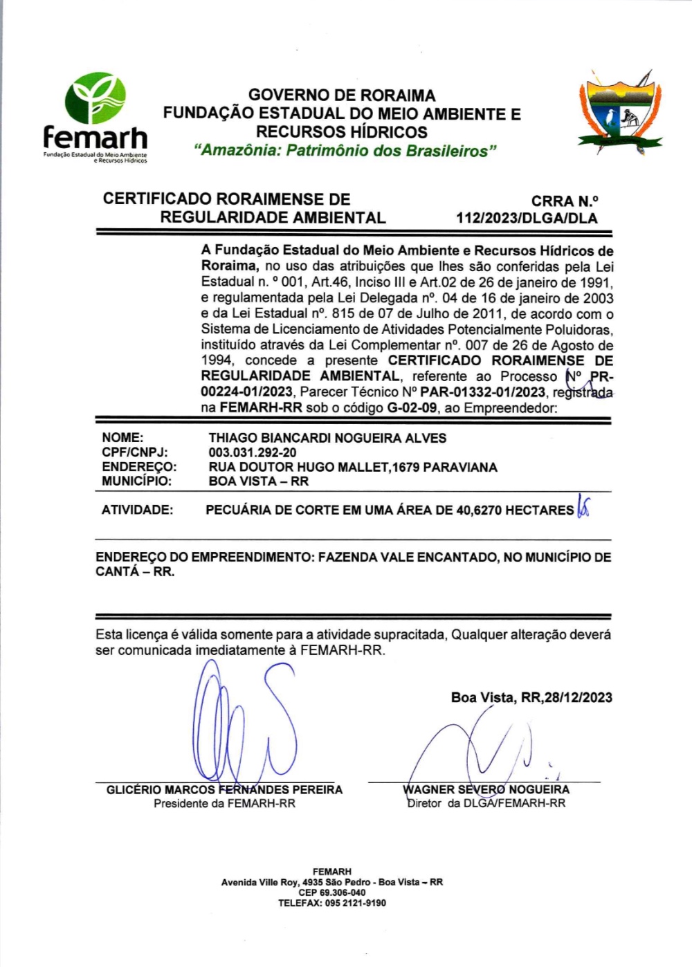 CERTIFICADO RORAIMENSE DE REGULARIDADE AMBIENTAL