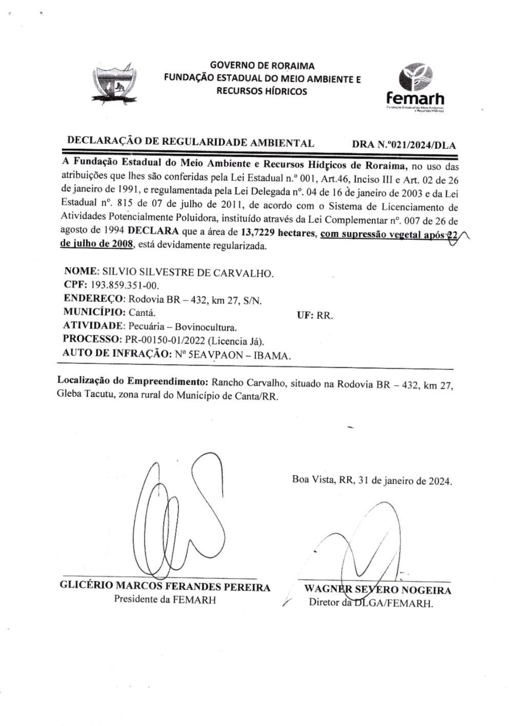 DECLARAÇÃO DE REGULARIDADE AMBIENTAL