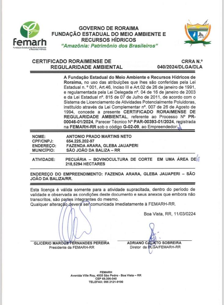 CERTIFICADO RORAIMENSE DE REGULARIDADE AMBIENTAL