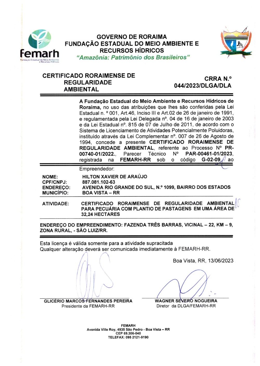 CERTIFICADO RORAIMENSE DE REGULARIDADE AMBIENTAL